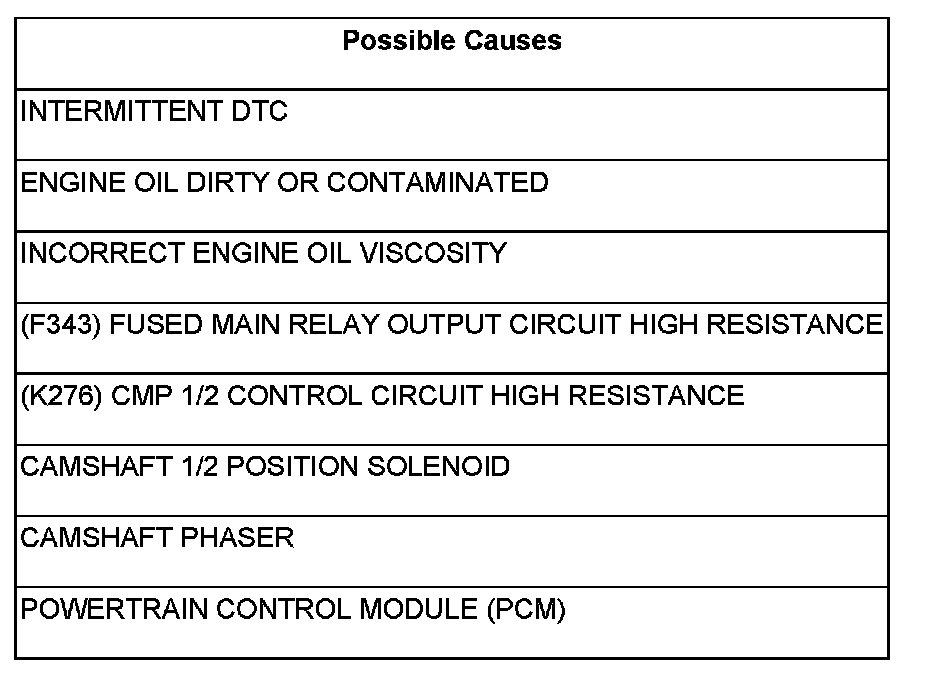 NOTE: If the engine oil is contaminated, inspect the Camshaft 1/2 Position Solenoid for contamination, foreign material, or any condition that would restrict movement of the valve. The solenoid must be replaced if it is damaged or if valve movement is restricted due to contamination.