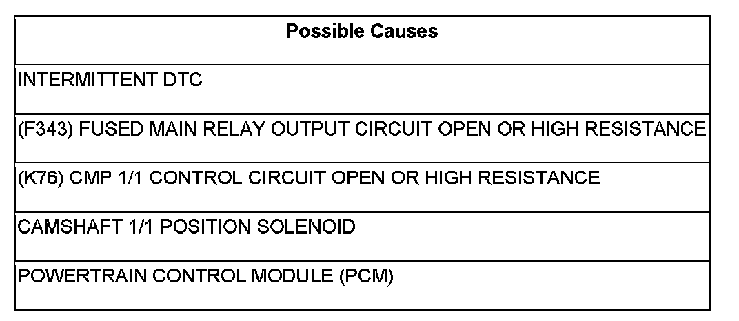 Using a 12 volt test light connected to ground, check the (F343) Fused Main Relay Output circuit in the Camshaft 1/1 Position Solenoid harness connector.