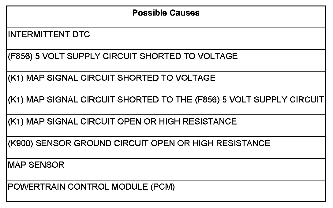 - Repair the (K1) MAP Signal circuit for a short to the (F856) 5 Volt Supply circuit.