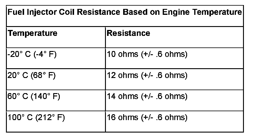 NOTE: The resistance of the circuit will vary according to the temperature of the injector coil. Use the table below to determine the resistance range of the injector.