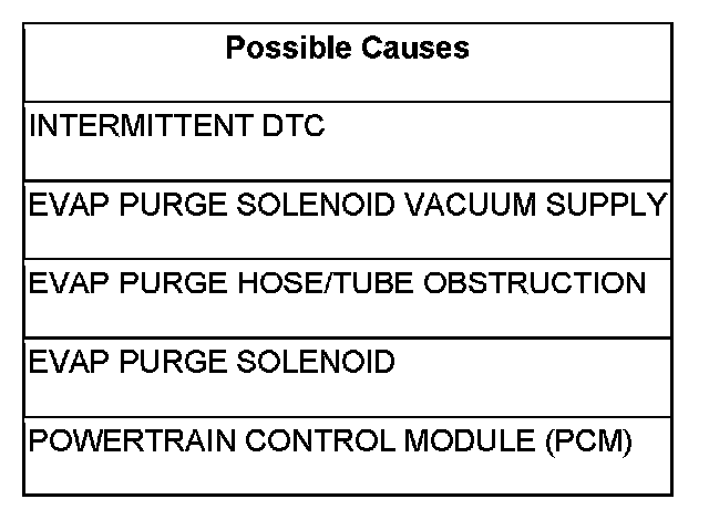 The Evap Purge Monitor tests the integrity of the hoses/tube between the throttle body/intake and the fuel tank. The monitor is a two stage test and runs only after the Evap system passes the small leak test. Stage one is non-intrusive. The PCM monitors the purge vapor ratio and the ESM switch closed ratio. If the purge vapor ratio is above a calculated value, the monitor passes. If the ESM switch closed ratio is greater than calculated value when purge flow is greater than a minimum value, the monitor passes. Stage two is an intrusive test and runs only if stage one does not pass. The PCM commands the purge solenoid to flow at a specified rate to force the purge vapor ratio to update. The ratio is compared to a calibrated specification. If it is less than specified, a one trip failure is recorded. This test can detect if the purge hose is off, obstructed, or the purge valve is not operational.
