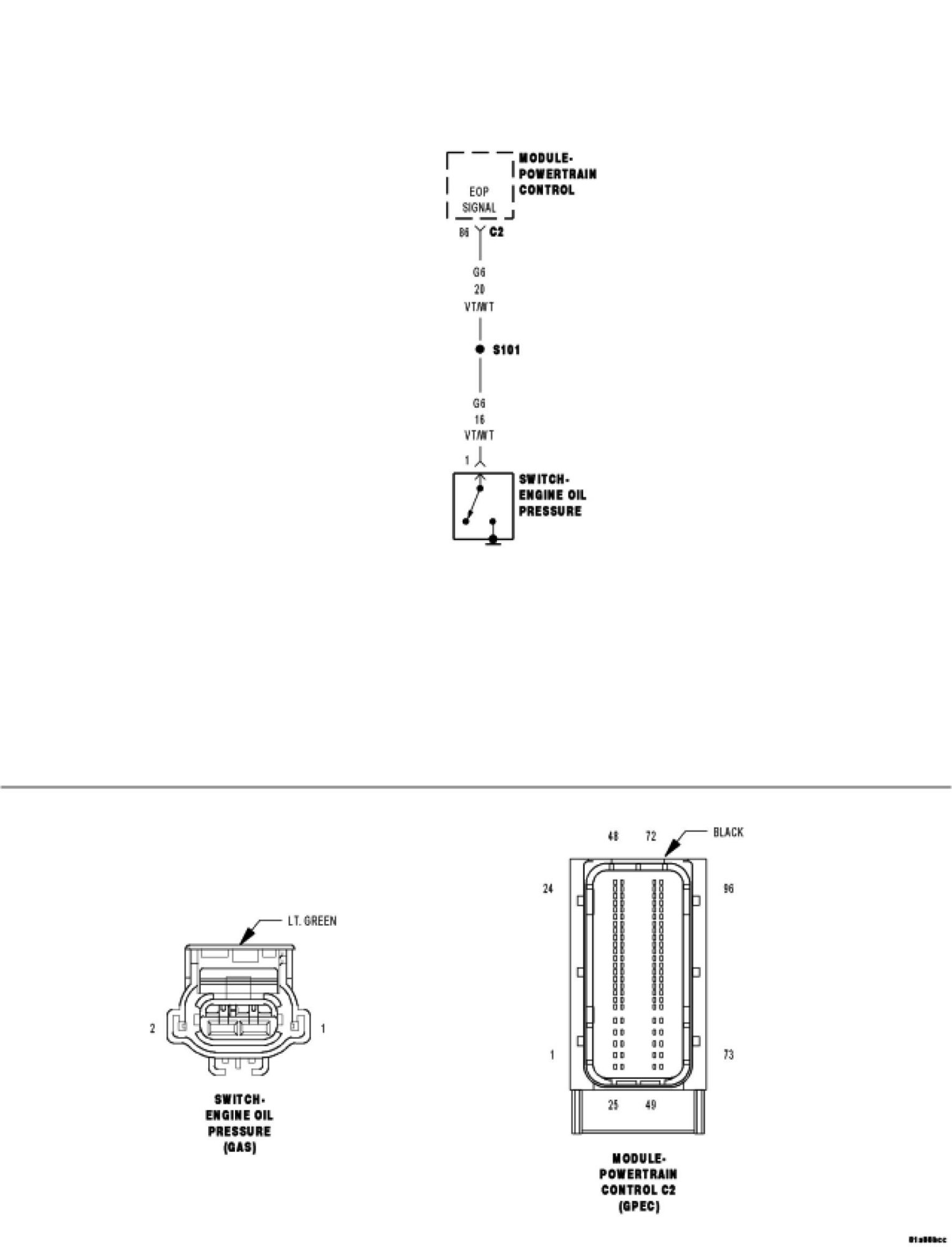Measure the resistance of the (G6) EOP Signal circuit between the Engine Oil Pressure Switch harness connector and the Powertrain Control Module (PCM) harness connector.