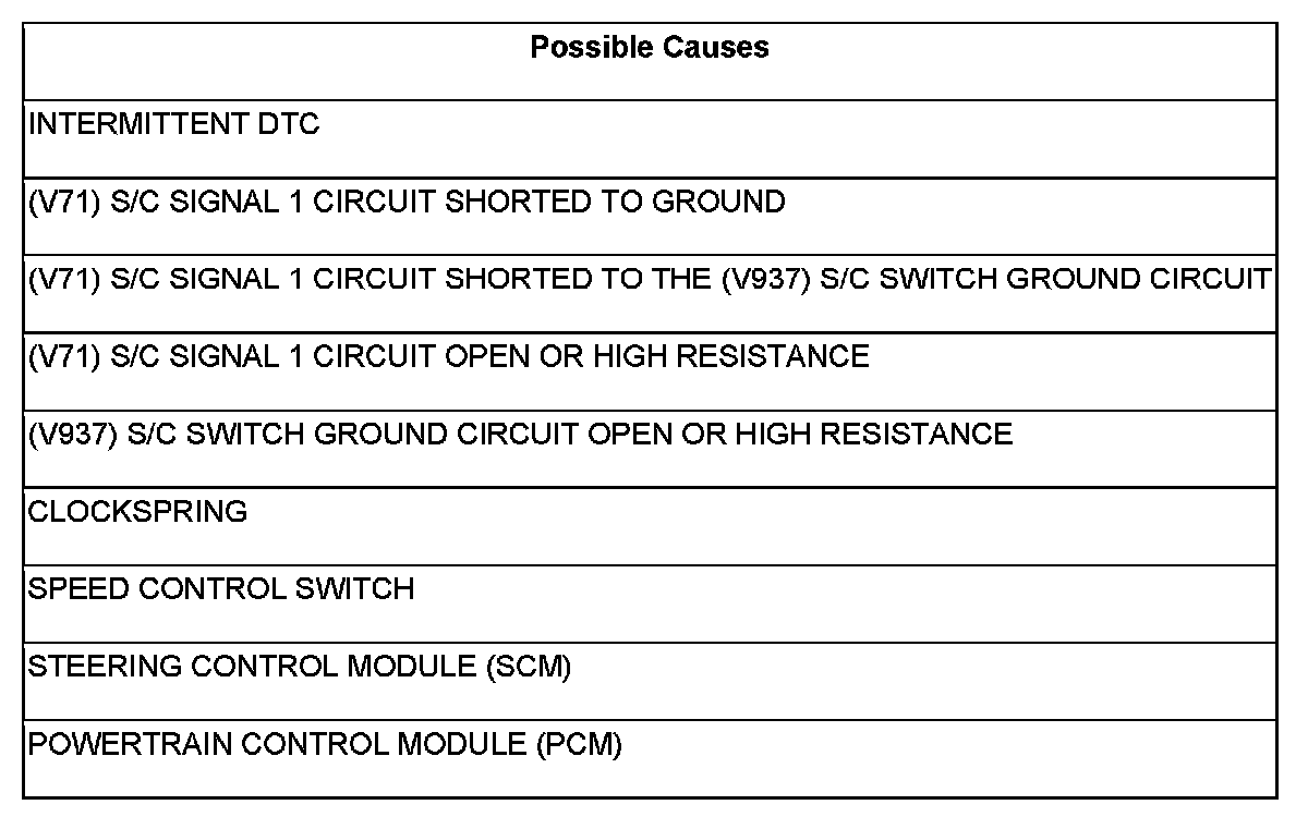 - Repair the (V71) S/C Signal 1 circuit for a short to the Steering Control Module (SCM) circuit.