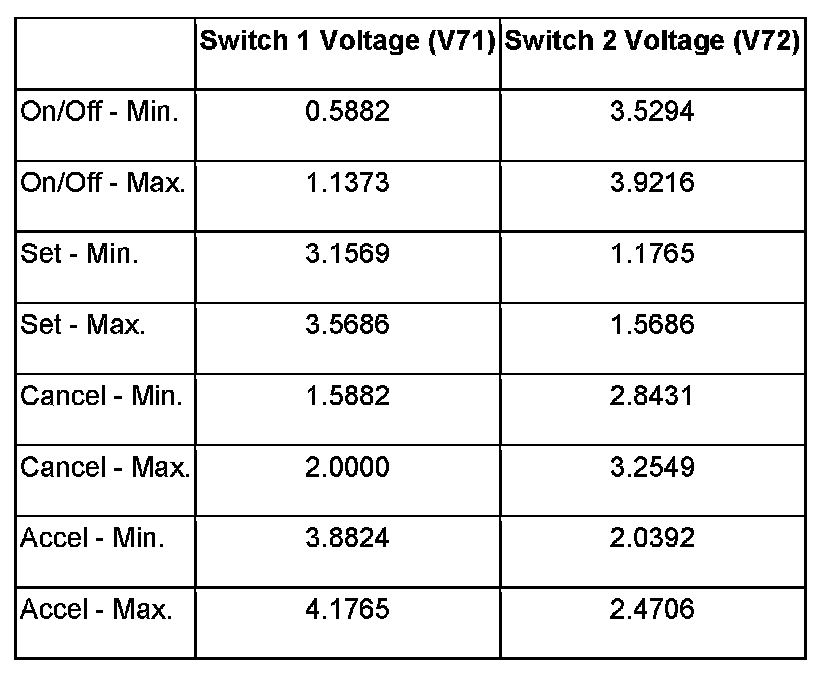 NOTE: Use the following table as a reference when diagnosing speed control switch voltage DTCs. Compare the voltage readings displayed on the scan tool with the values in the table.