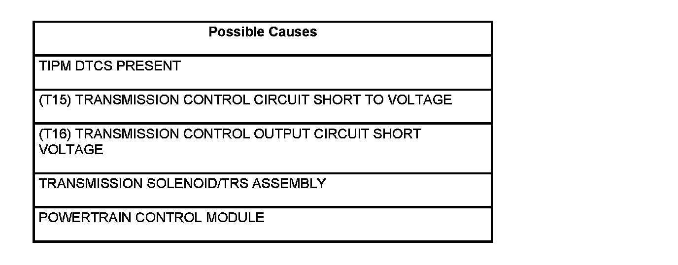 After a PCM reset, (ignition switch turned to the run position, or after cranking the engine) the Transmission Control System verifies that the Transmission Output circuit is open by checking for voltage on the Transmission Output circuits before the Transmission Control System request for the circuit to be powered up. The request is sent by a direct circuit control from the PCM to the TIPM. If voltage is detected on the Transmission Output circuits before the request is sent, the DTC will set.