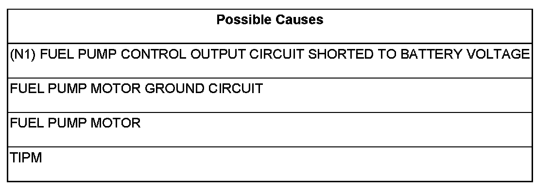 - Repair the short to battery voltage in the (N1) Fuel Pump Control Output circuit.