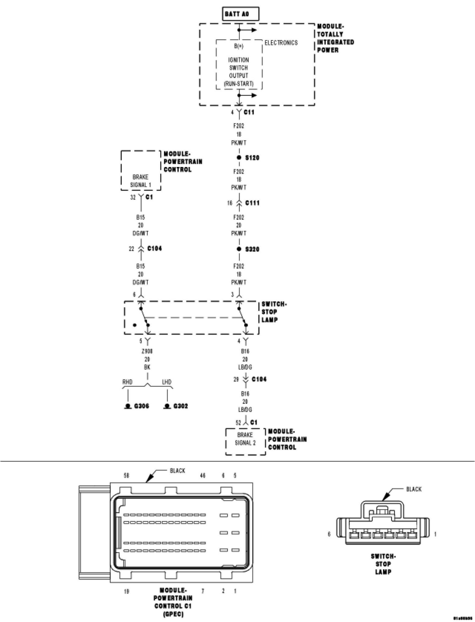 Using the wiring diagram/schematic as a guide, inspect the wiring and connectors between the Stop Lamp Switch and the Powertrain Control Module (PCM).