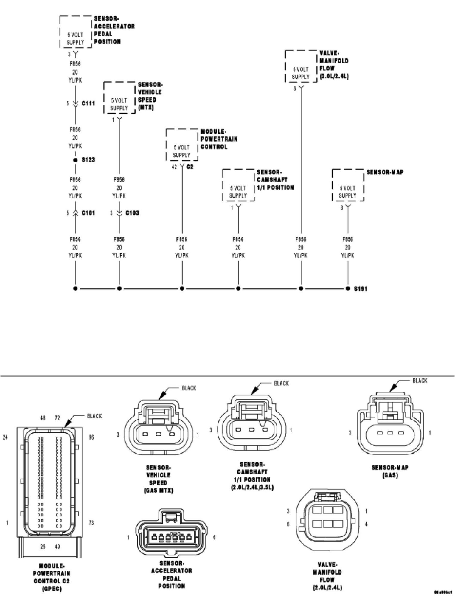 Disconnect the connector from each sensor that shares the (F856) 5 Volt Supply.