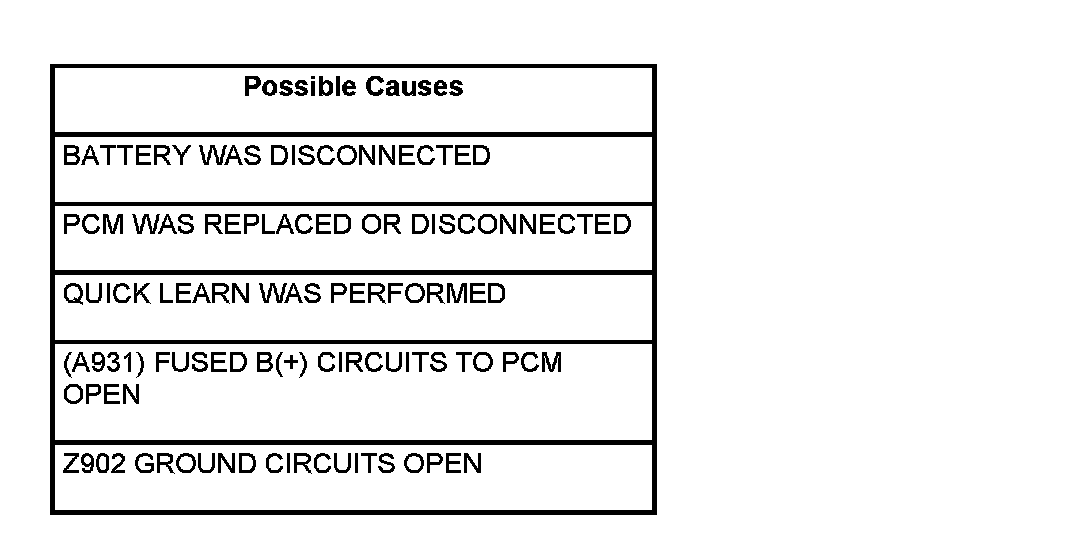 Note: This is not a fault code. It exists to provide reference information only. A battery backed RAM is used to maintain some learned values. When the battery is disconnected, this memory is lost. When the battery is reconnected, the loss of learned values will be detected by the controller. The code will be set and the learned values will be initialized to known constants and the learning process will continue. Setting the code has no effect except for re-initialization of learned values.