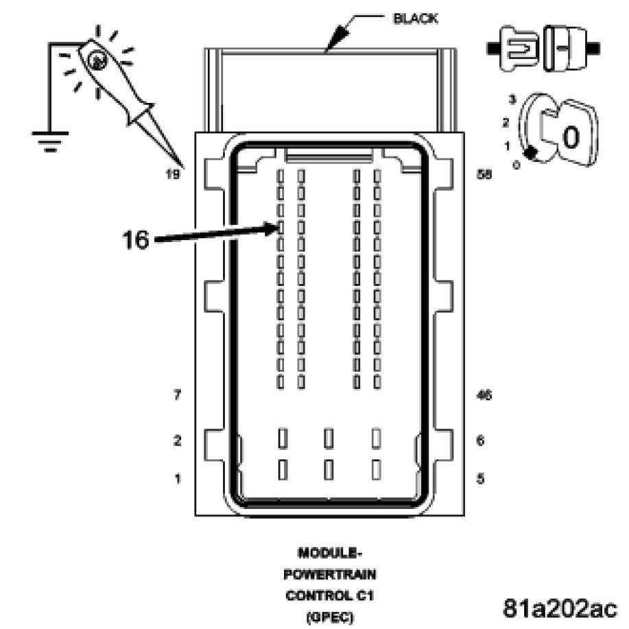 Using a 12-volt test light connected to ground, check the (A931) Fused B(+) circuit in the PCM C1 harness connector.