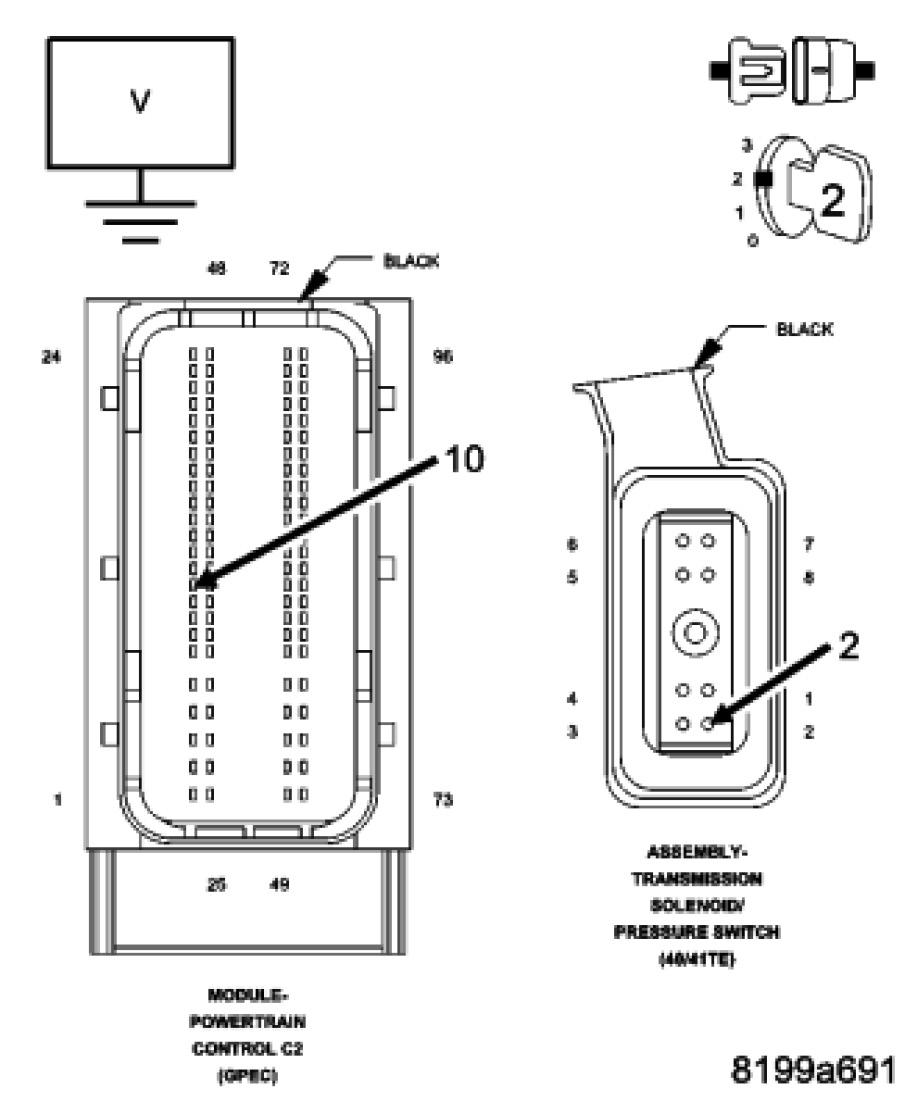 Measure the resistance of the (T50) L/R Pressure Signal circuit between the PCM C2 harness connector and the Transmission Solenoid/Pressure Switch Assembly harness connector.