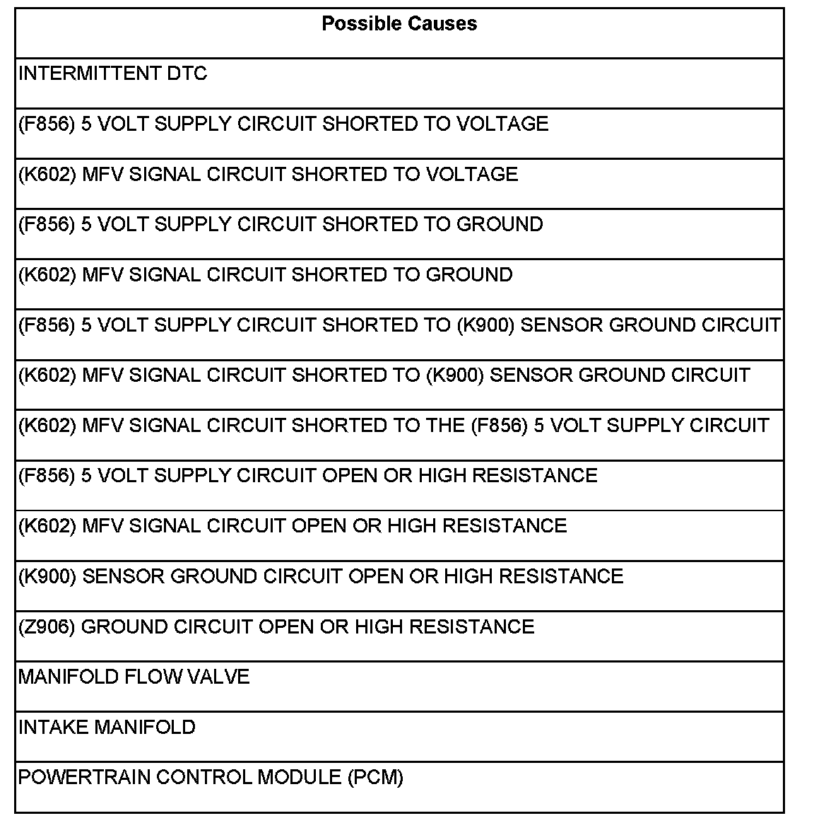 - Repair the (K602) MFV Signal circuit for a short to the (F856) 5 Volt Supply circuit.