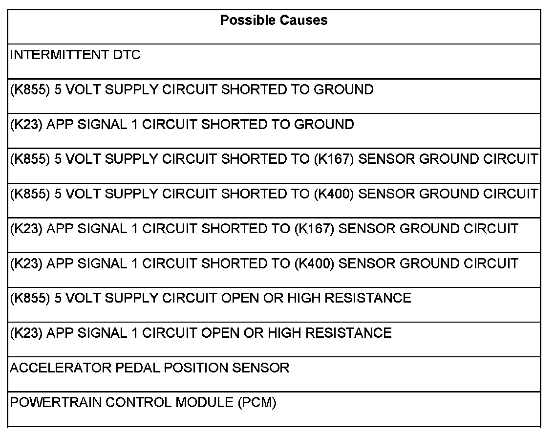 - Repair the (K23) APP Signal 1 circuit for a short to the (K167) Sensor Ground circuit.