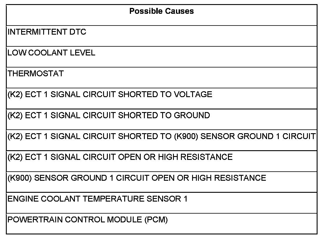 - Repair the (K2) ECT 1 Signal circuit for a short to the (K900) Sensor Ground 1 circuit.