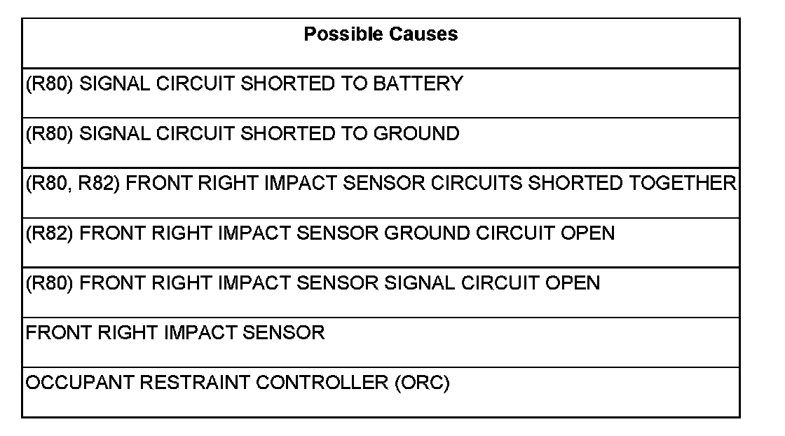 - Repair the (R80) and (R82) Front Right Impact Sensor circuits for a short to battery.