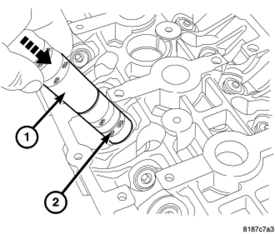 3. Place the valve keepers in the retainer. Using metric valve keeper tool such as Snap-on(R) GA317 (or equivalent) installer (2) and remover (1) as a handle, install valve keepers with a downward push.