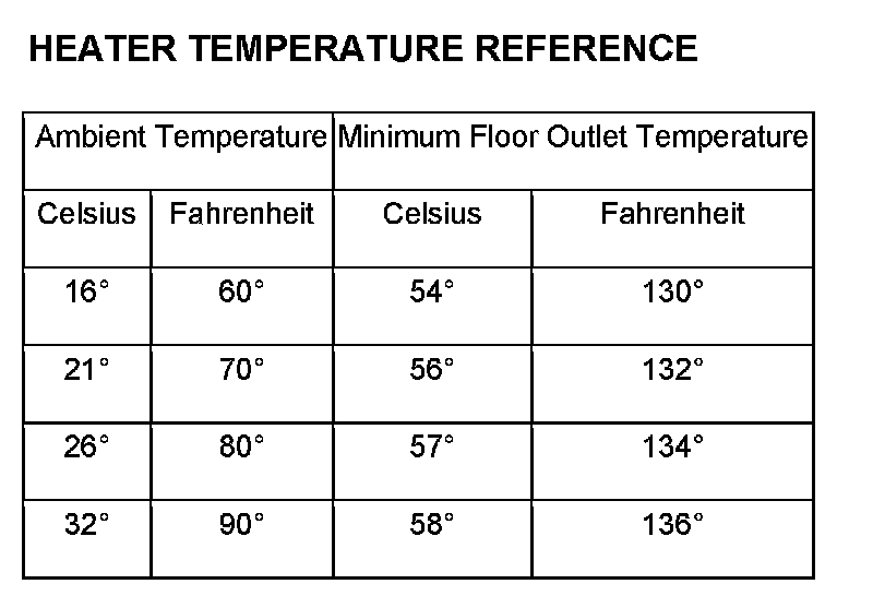 Engine coolant is delivered to and from the heater core through two heater hoses. With the engine idling at normal operating temperature, set the temperature control to the full hot position, the mode control to the floor position, and the blower motor control to the highest speed position. Using a test thermometer, check the temperature of the air being discharged at the front floor outlets. Compare the test thermometer reading to the Heater Temperature Reference chart.