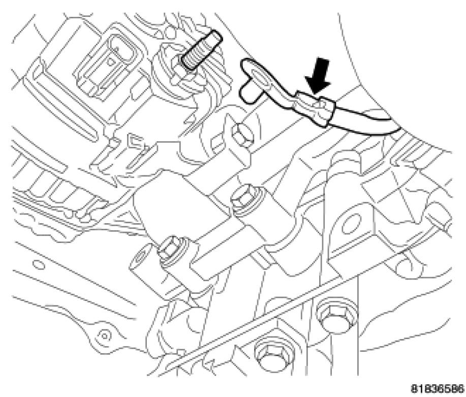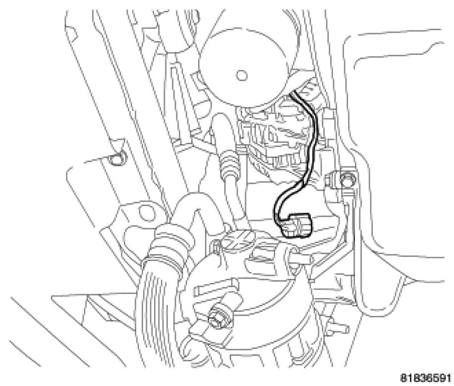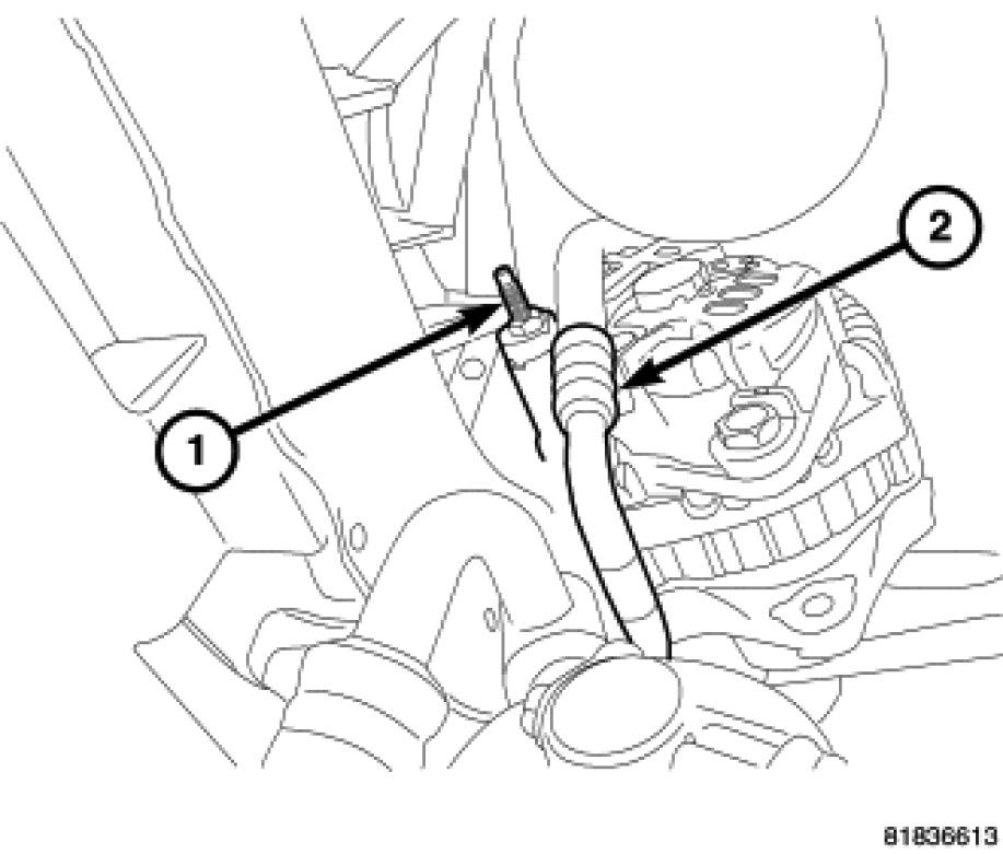 13. Relocate the battery terminal (1) to the other side of the A/C line (2) for removal of the generator.