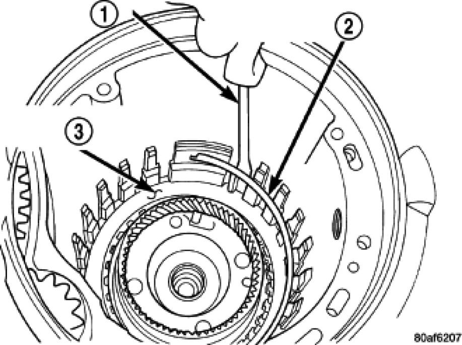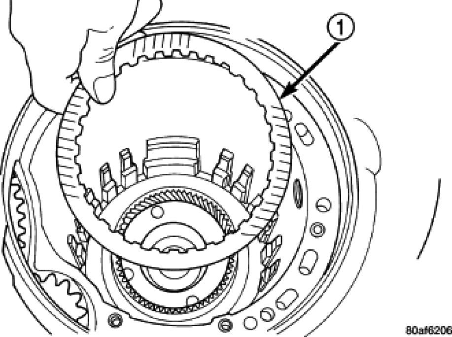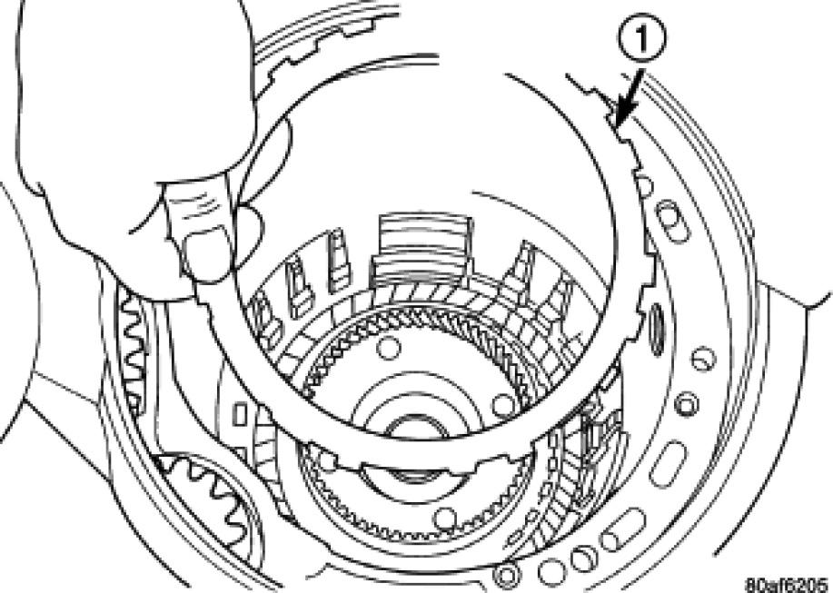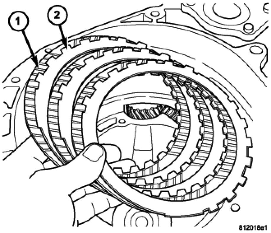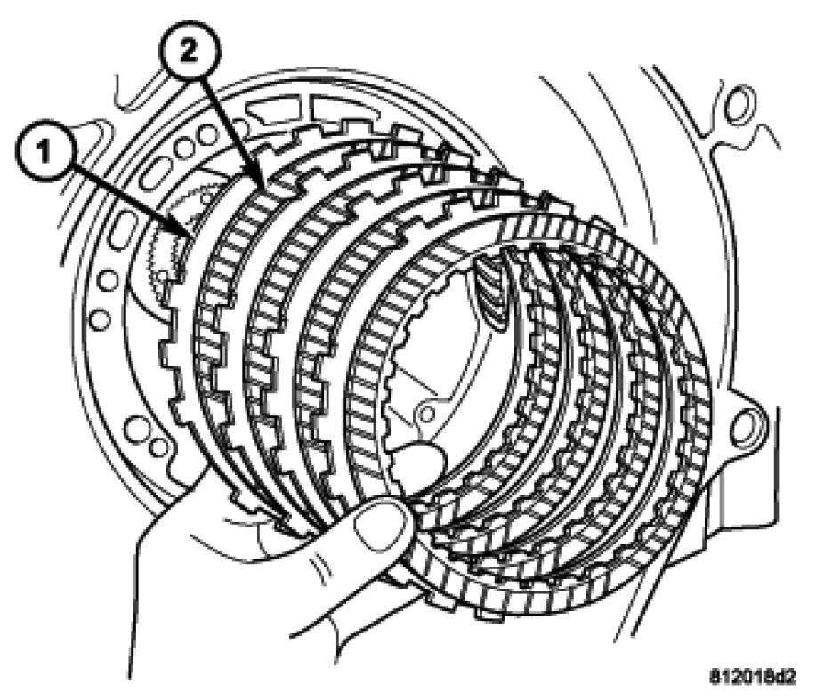 42. Install low/reverse clutch pack (1, 2). Leave uppermost disc out until snap ring is installed.