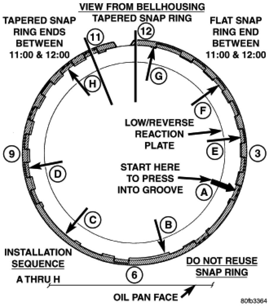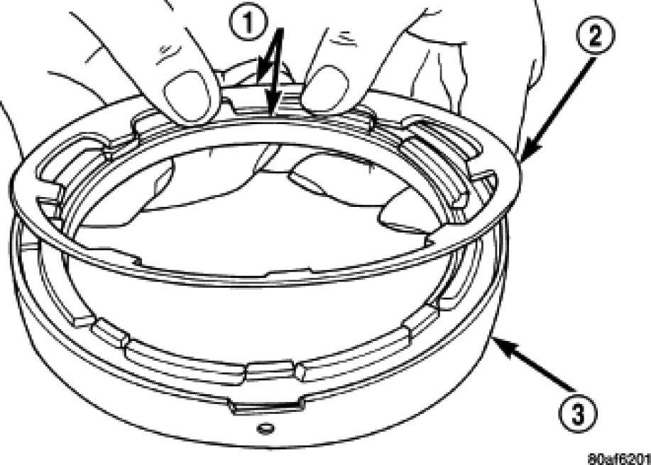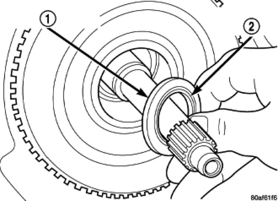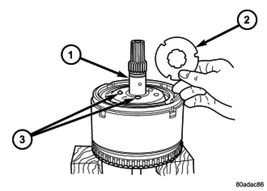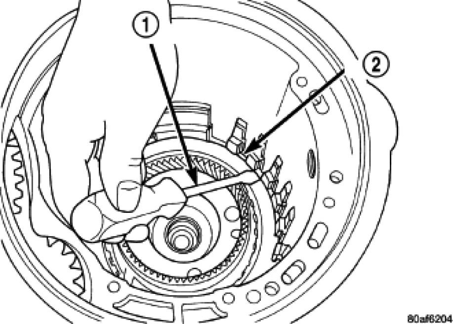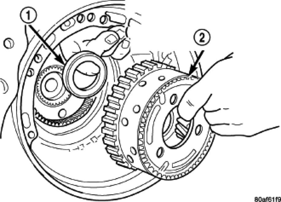 NOTE: The number seven needle bearing (1) has three anti-reversal tabs and is common with the number five and number two position. The orientation should allow the bearing to seat flat against the rear sun gear. A small amount of petrolatum can be used to hold the bearing to the rear sun gear.