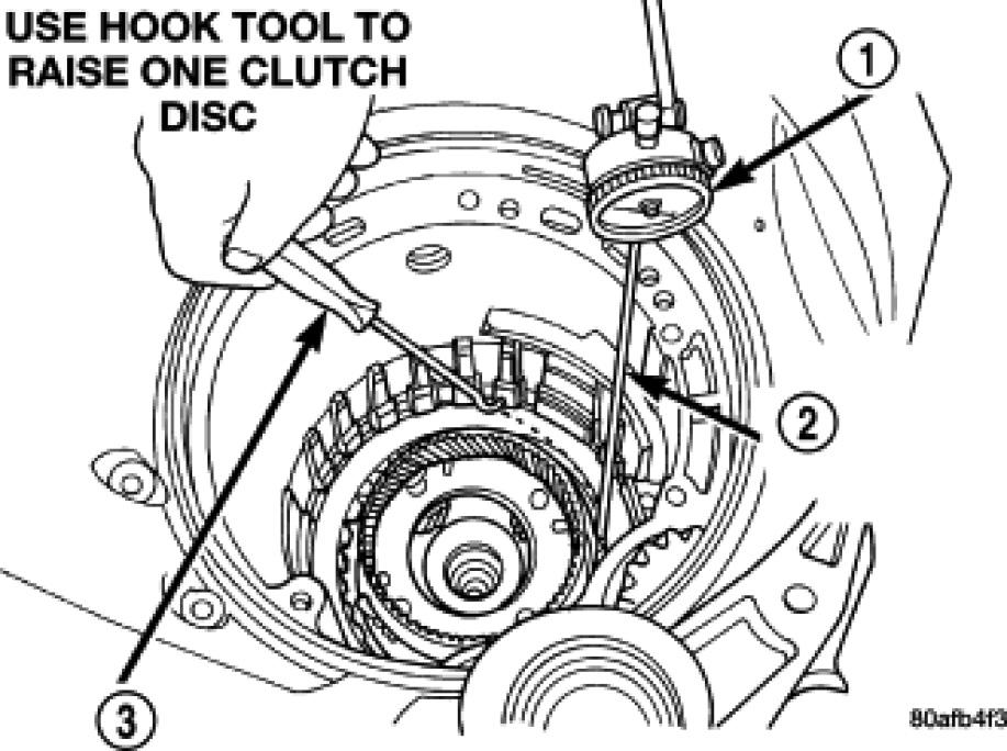54. Set up Dial Indicator (1), Indicator tip 6268 (3) and Hook tool (2), measure 2/4 clutch clearance. Press down on clutch pack with finger and zero dial indicator. 2/4 clutch pack clearance is 0.76-2.64 mm (0.030-0.104 in.). Set up indicator and record measurement in four places. Take average of readings. If clearance is outside this range, the clutch is assembled improperly. There is no adjustment for 2/4 clutch clearance.