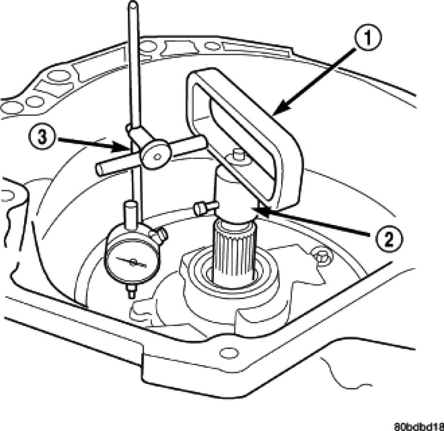 63. Measure the input shaft end play with the transaxle in the vertical position. Input shaft end play must be within 0.005 to 0.025 inch. For example, if end play reading is 0.055 inch, select # 4 Thrust Plate which is 0.071 to 0.074 thick. This should provide an input shaft end play reading of 0.020 inch which is within specifications.