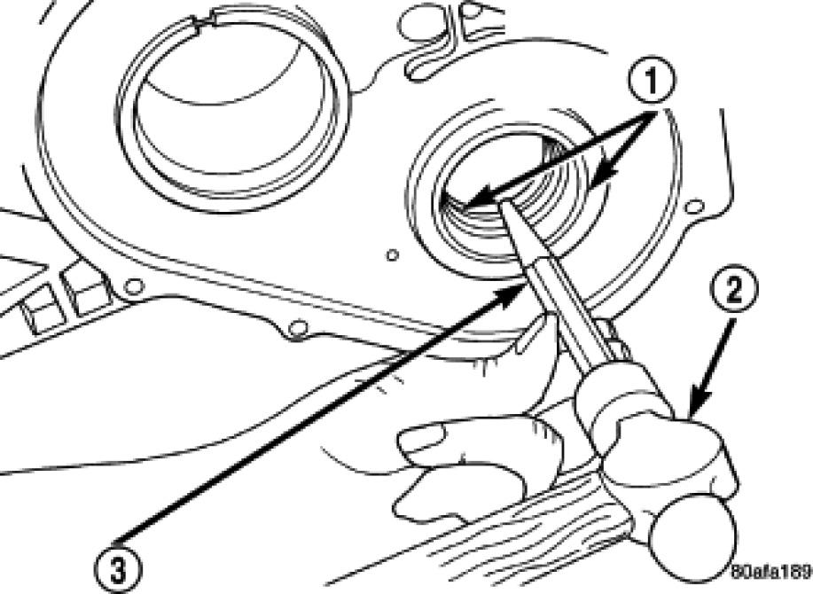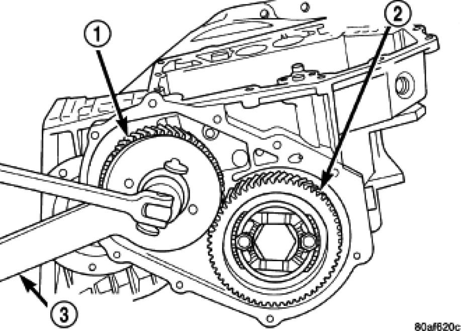 73. Using a hammer (2) and suitable drift (3), drive out inner output bearing cup (1).