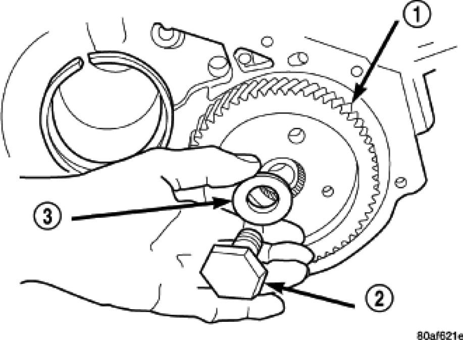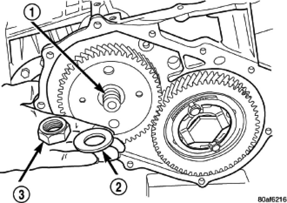 56. Remove output shaft gear-to-shaft bolt (2) and washer (3).