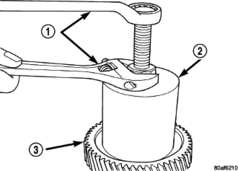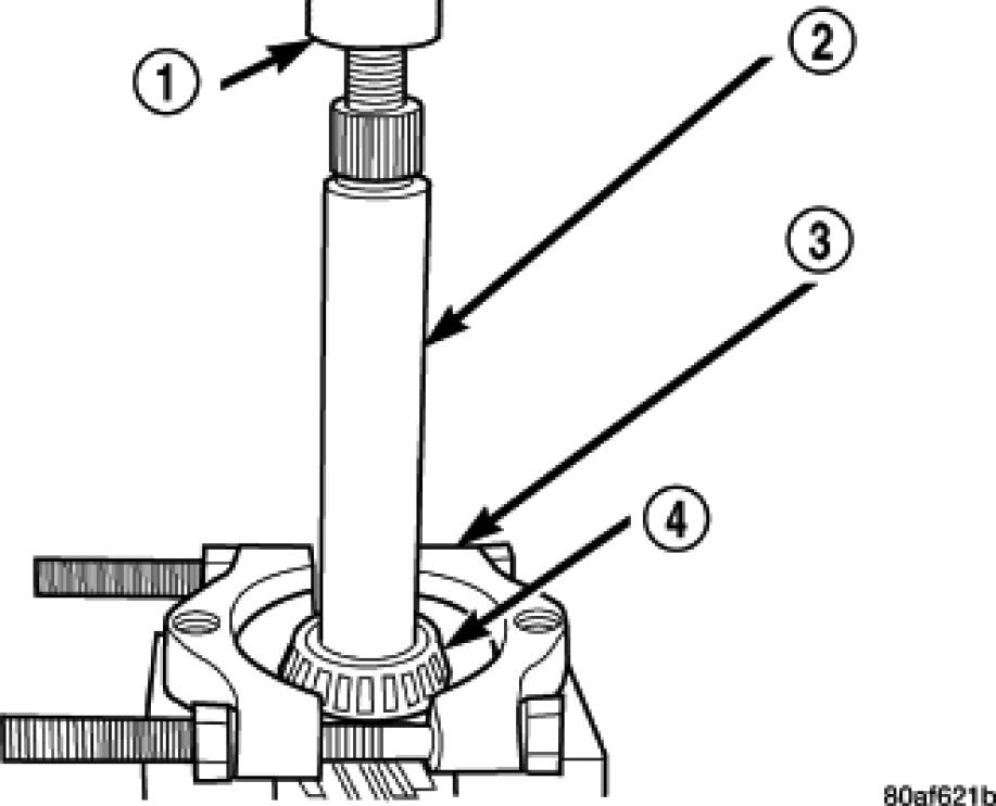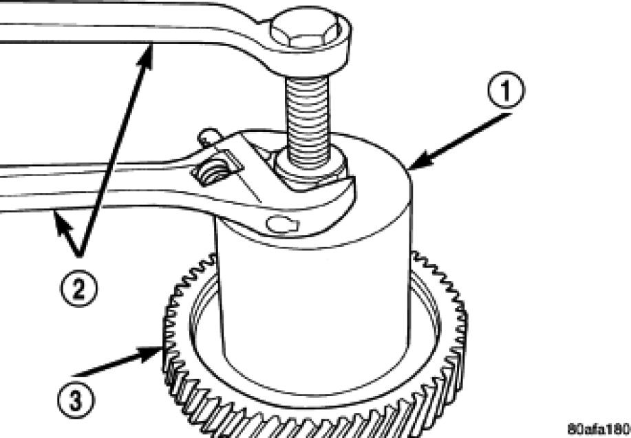57. Using Gear Puller L-4407A (4), and Button 6055 (2), remove output gear (1) from shaft.