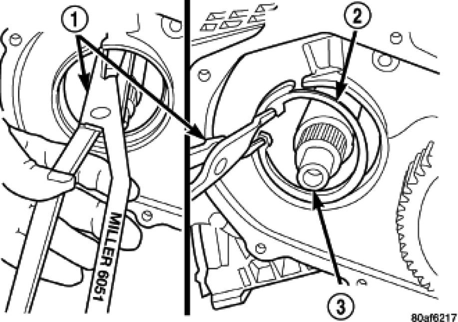 48. Using Snap Ring Pliers 6051(1), remove transfer shaft bearing snap ring (2).