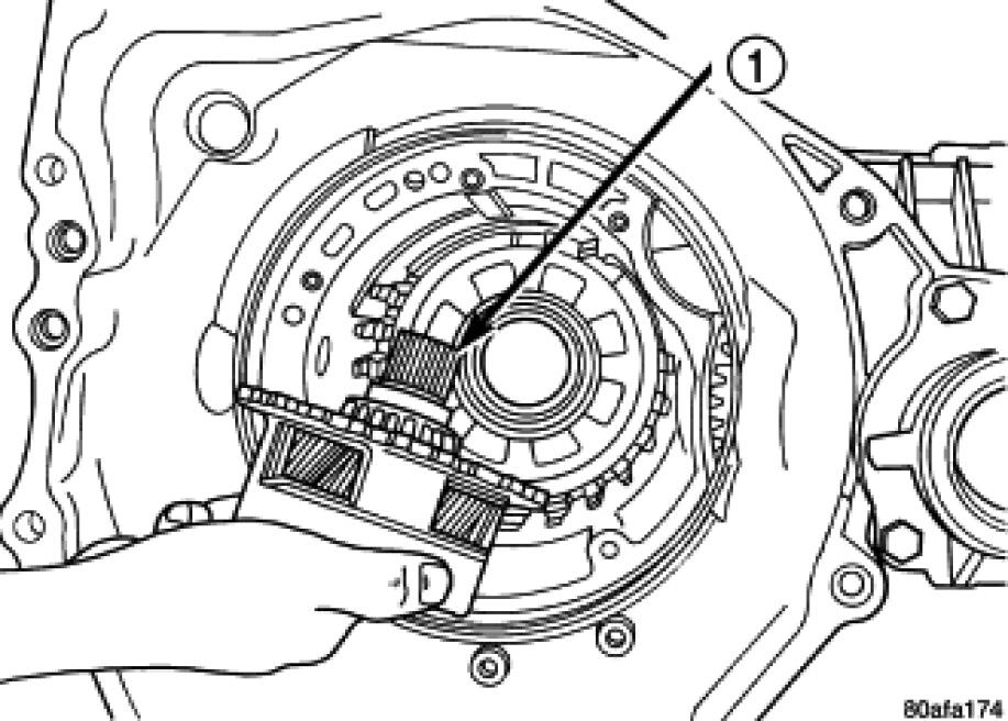 65. Remove low/reverse Spring Compressor 5059 and low reverse piston return spring (1).
