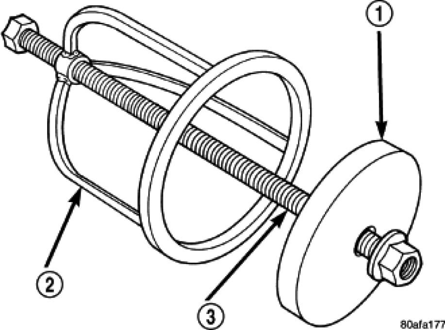 63. Install low/reverse spring compressor Disc 6057 (1), Compressor 5059 (2) and Bar 5058-3 (3).