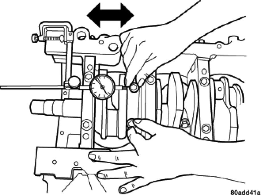 1. Mount a dial indicator to a stationary point on engine. Locate probe perpendicular to and resting against the connecting rod cap being checked. Move connecting rod all the way to rear of its travel. Zero the dial indicator. Move connecting rod forward to limit of travel and read the dial indicator. Compare measurement to specification listed in engine specifications (Refer to 9 - ENGINE - SPECIFICATIONS). Repeat procedure for each connecting rod. Turn crankshaft for connecting rod accessibility.