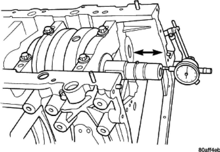 1. Mount a dial indicator to a stationary point at front of engine. Locate the probe perpendicular against nose of crankshaft.
