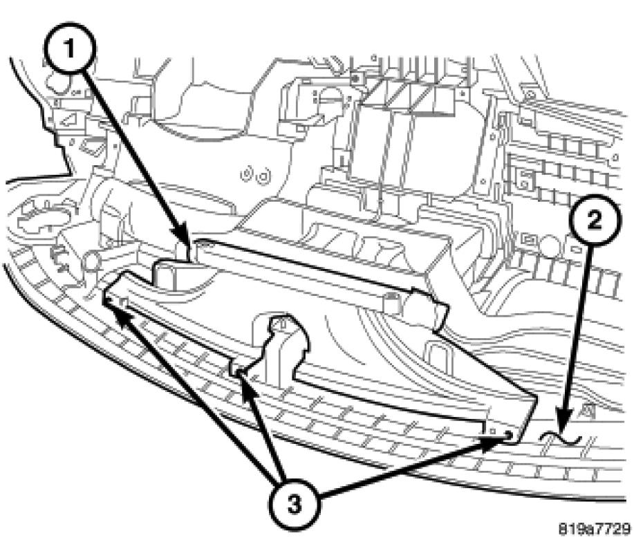 2. Install the three screws (3) that secure the defroster duct to the instrument panel top cover. Tighten the screws to 2.2 Nm (20 in. lbs.).