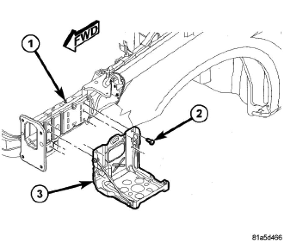 2. Position the battery tray (3) onto the left front frame rail (1).