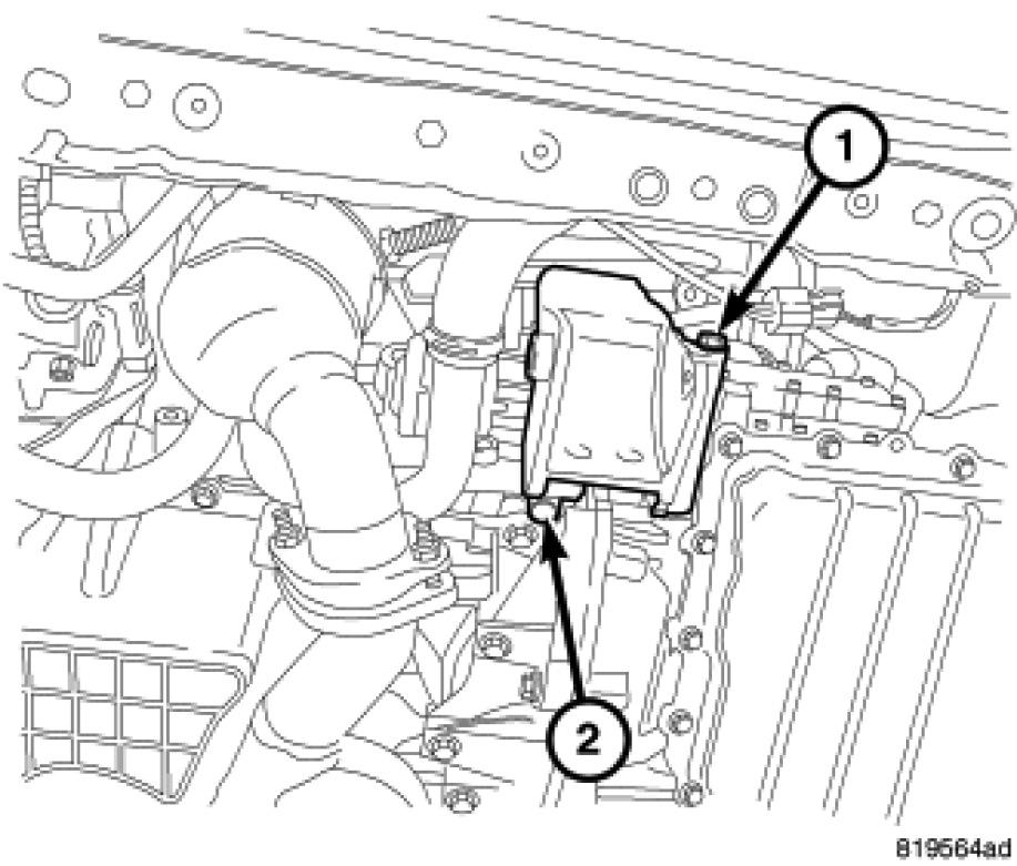8. Install the engine anti-roll mount and bolts (1) and (2). Tighten to 50 Nm (37 ft.lbs.)