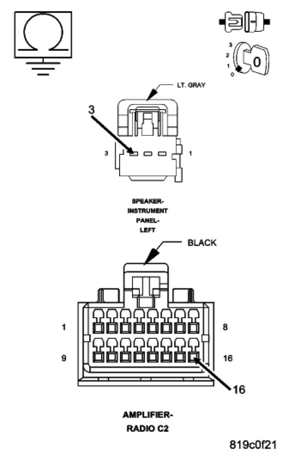 Measure the resistance of the speaker circuit between the Amplifier C1 harness connector and ground.