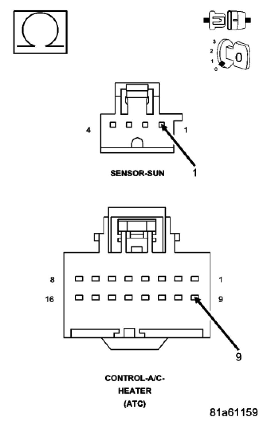 Measure the resistance of the (G939) Sensor Return circuit between the Sunload Sensor harness connector and the A/C Heater Control C1 harness connector.