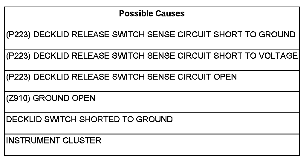 - Repair the (P223) Decklid Release Switch Sense circuit for a short to ground.