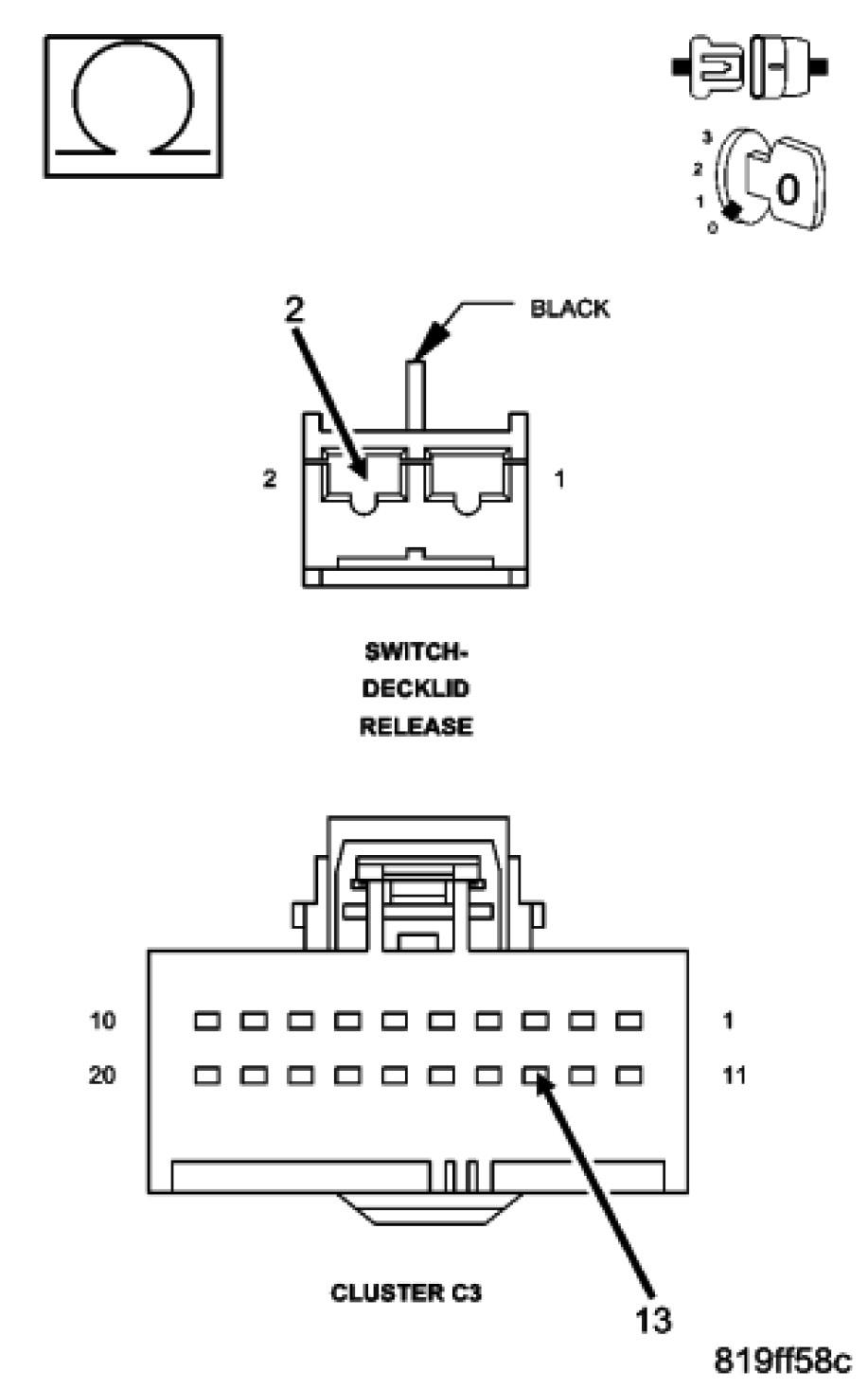 Measure the resistance of the (P223) Decklid Release Switch sense circuit between the switch connector and the Cluster C3 connector.