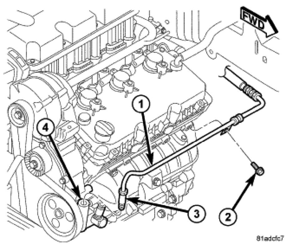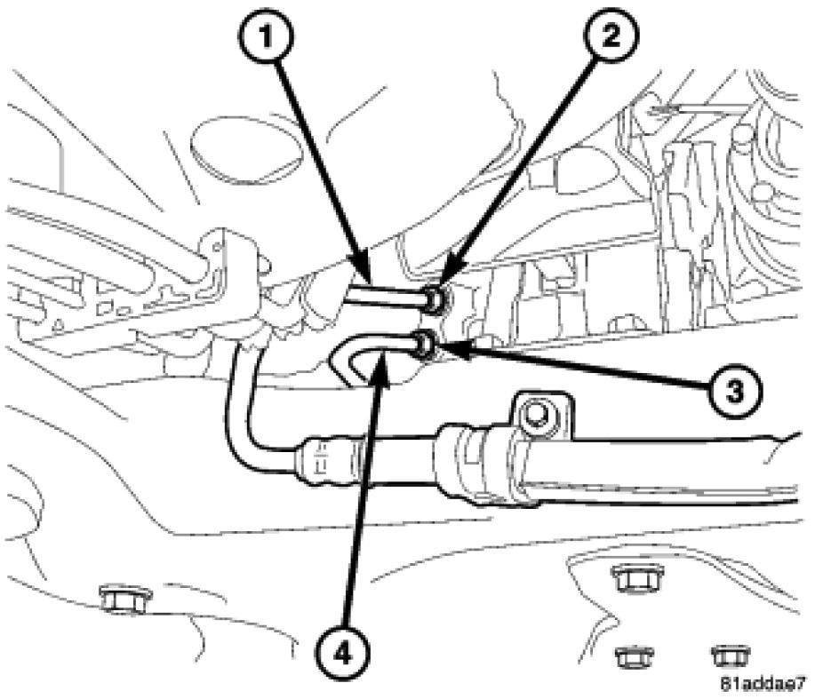7. Install the pressure hose (1) at the power steering pump (4). Tighten the tube nut (3) to 32 Nm (24 ft. lbs.).