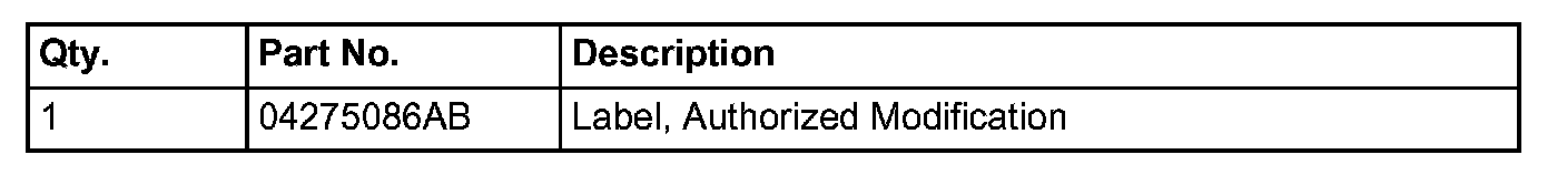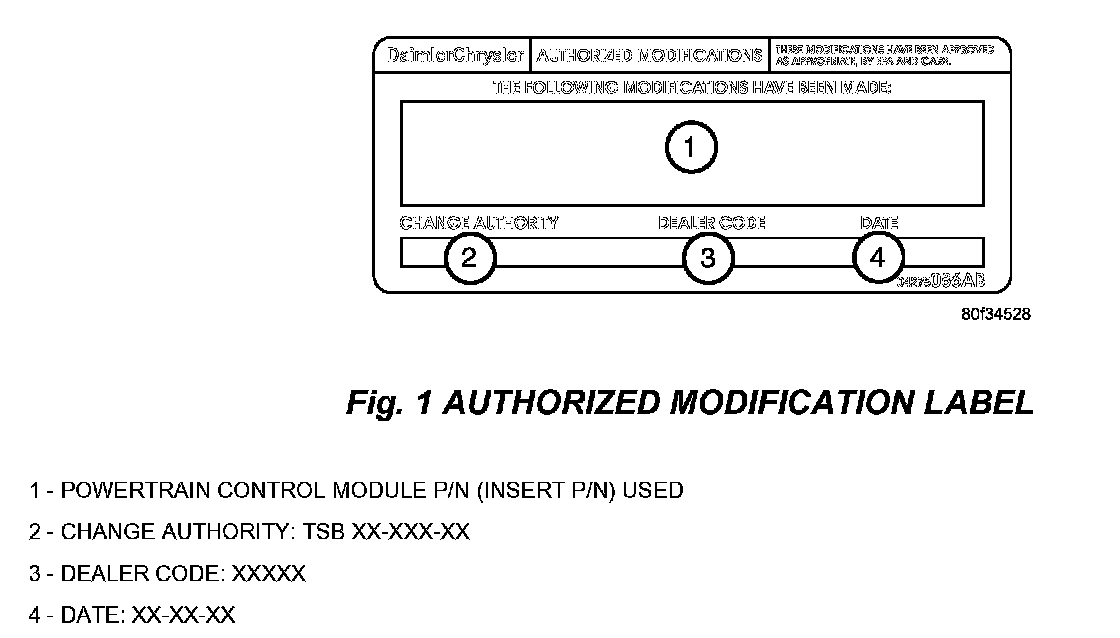 15. Type the necessary information on the "Authorized Modification Label" p/n 04275086AB and attach near the VECI label (Fig. 1).