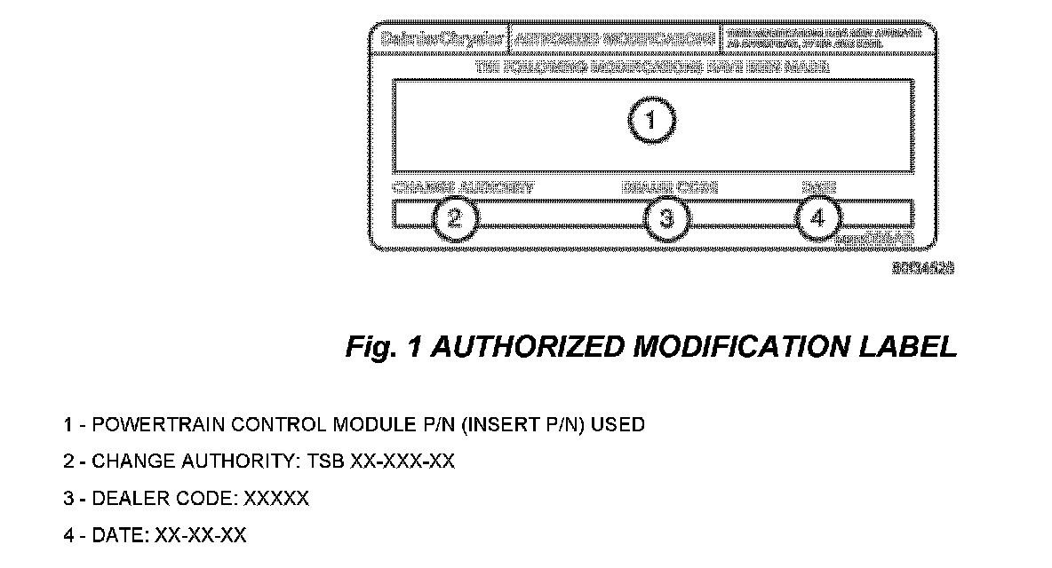 13. Type the necessary information on the "Authorized Modification Label" p/n 04275086AB and attach near the VECI label (Fig 1).