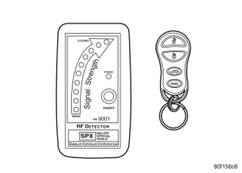 Using special tool 9001, first test to ensure that the transmitter is functioning. Typical testing distance is 2.5 centimeters (1 inch) for Asian transmitters and 30.5 centimeters (12 inches) for all others. To test, position the transmitter as shown. Press any transmitter button, then test each button individually. The tool will beep if a radio signal strength that lights five or more LED's is detected. Repeat this test three times.
