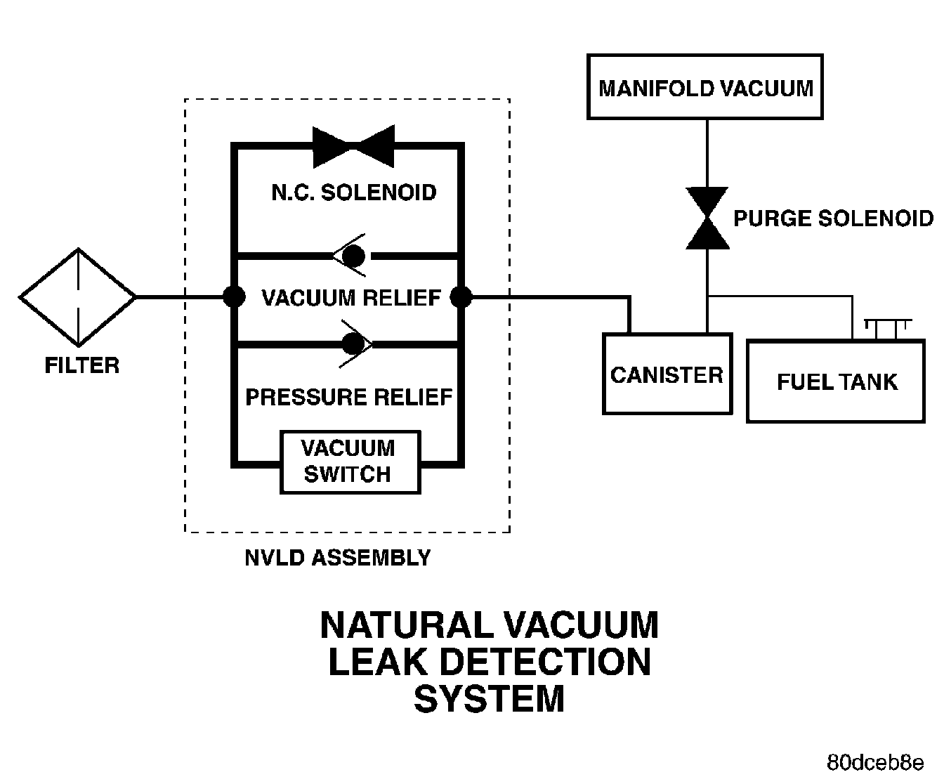 The Natural Vacuum Leak Detection (NVLD) system is the next generation evaporative leak detection system that will first be used on vehicles equipped with the Powertrain Control Module (PCM) or Next Generation Controller (NGC) starting in 2002 M.Y. This new system replaces the leak detection pump as the method of evaporative system leak detection. The current CARB requirement is to detect a leak equivalent to a 0.020 inches (0.5 mm) hole. This system has the capability to detect holes of this size very dependably.