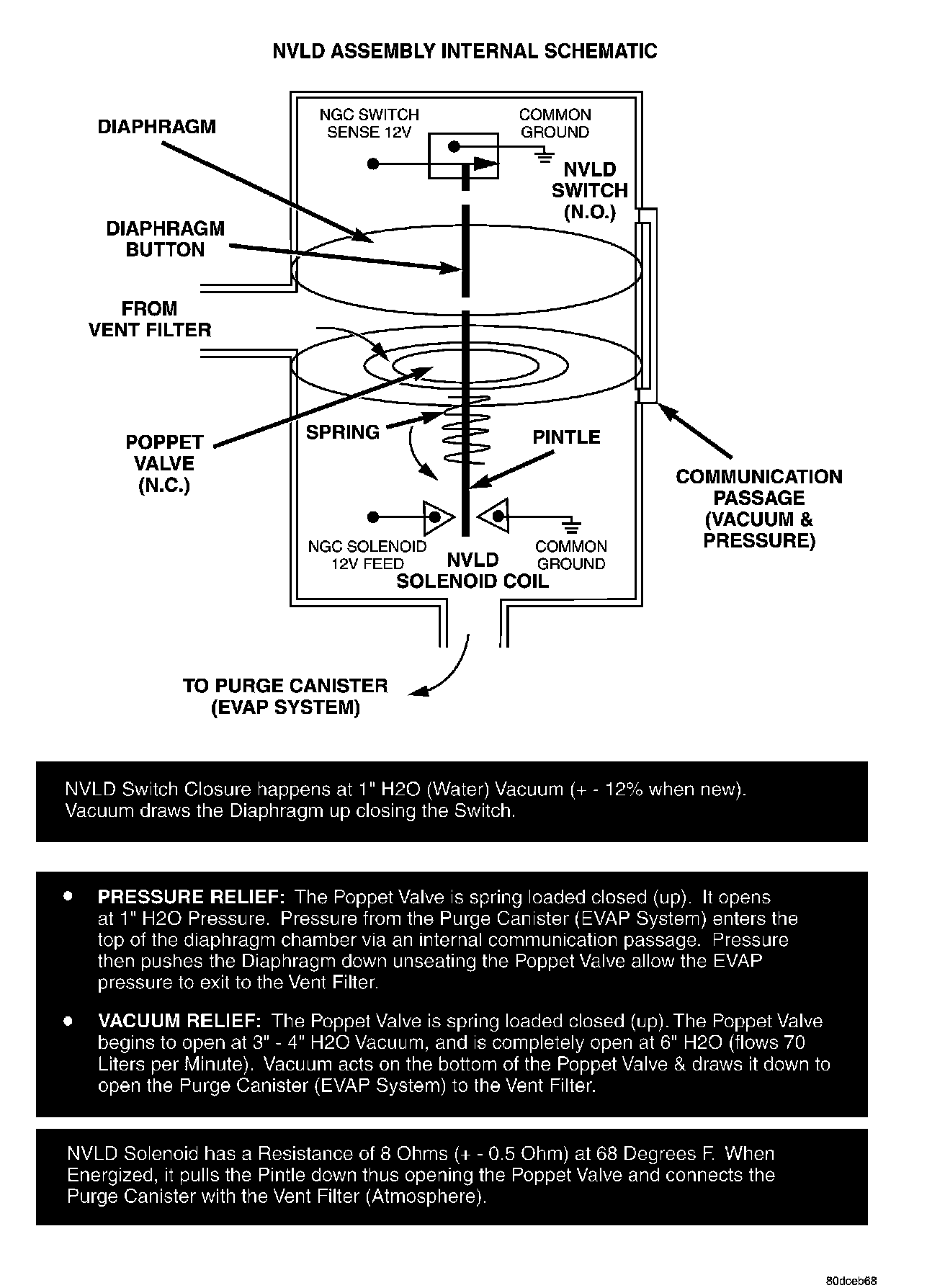 The normally closed valve in the NVLD is intended to maintain the seal on the evaporative system during the engine off condition. If vacuum in the evaporative system exceeds 3 inches to 6 inches H2O (0.75 to 1.5 KPA), the valve will be pulled off the seat, opening the seal. This will protect the system from excessive vacuum as well as allowing sufficient purge flow in the event that the solenoid was to become inoperative. The solenoid actuates the valve to unseal the canister vent while the engine is running. It also will be used to close the vent during the medium and large leak tests and during the purge flow check. This solenoid requires initial 1.5 amps of current to pull the valve open but after 100 ms. will be duty cycled down to an average of about 150 mA for the remainder of the drive cycle.