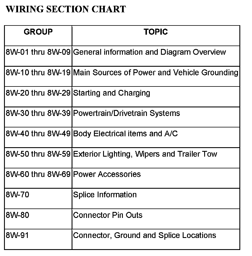 The wiring diagrams are grouped into individual sections. If a component is most likely found in a particular group, it will be shown complete (all wires, connectors, and pins) within that group. For example, the Auto Shutdown Relay is most likely to be found in Powertrain/Drivetrain Systems, so it is shown there complete. It can, however, be shown partially in another group if it contains some associated wiring.