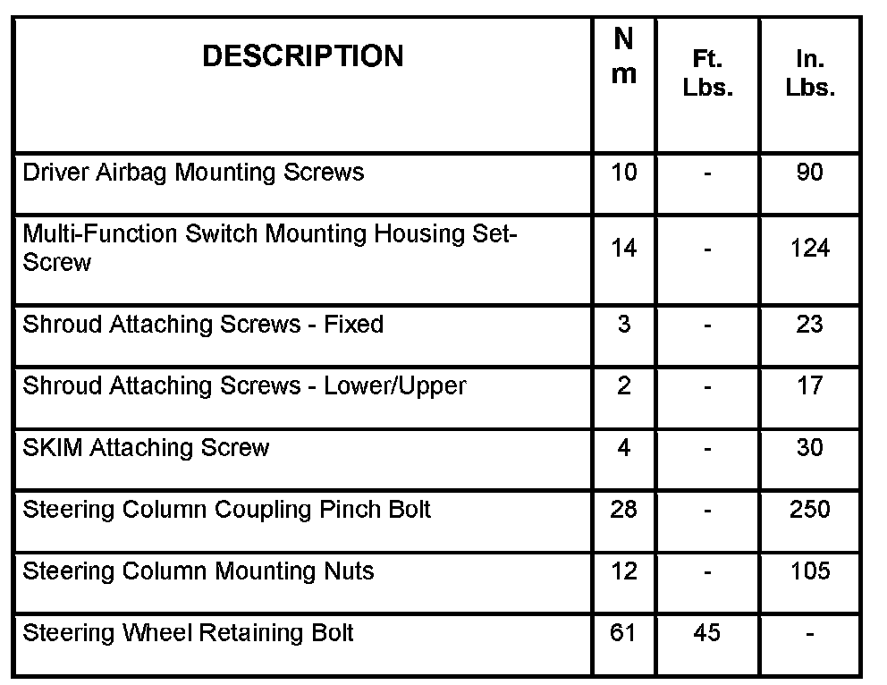 Steering Column Fastener Torque Specifications: