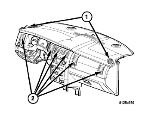 There are six instrument panel air outlets (2). One air outlet is located near each end of the instrument panel facing the rear of the vehicle, one outlet is on each side of the instrument panel center bezel and two outlets are located within the center bezel. Each of the instrument panel air outlets contain a grille with movable vanes that are used to direct or shut off the flow of the conditioned air leaving the instrument panel outlets.